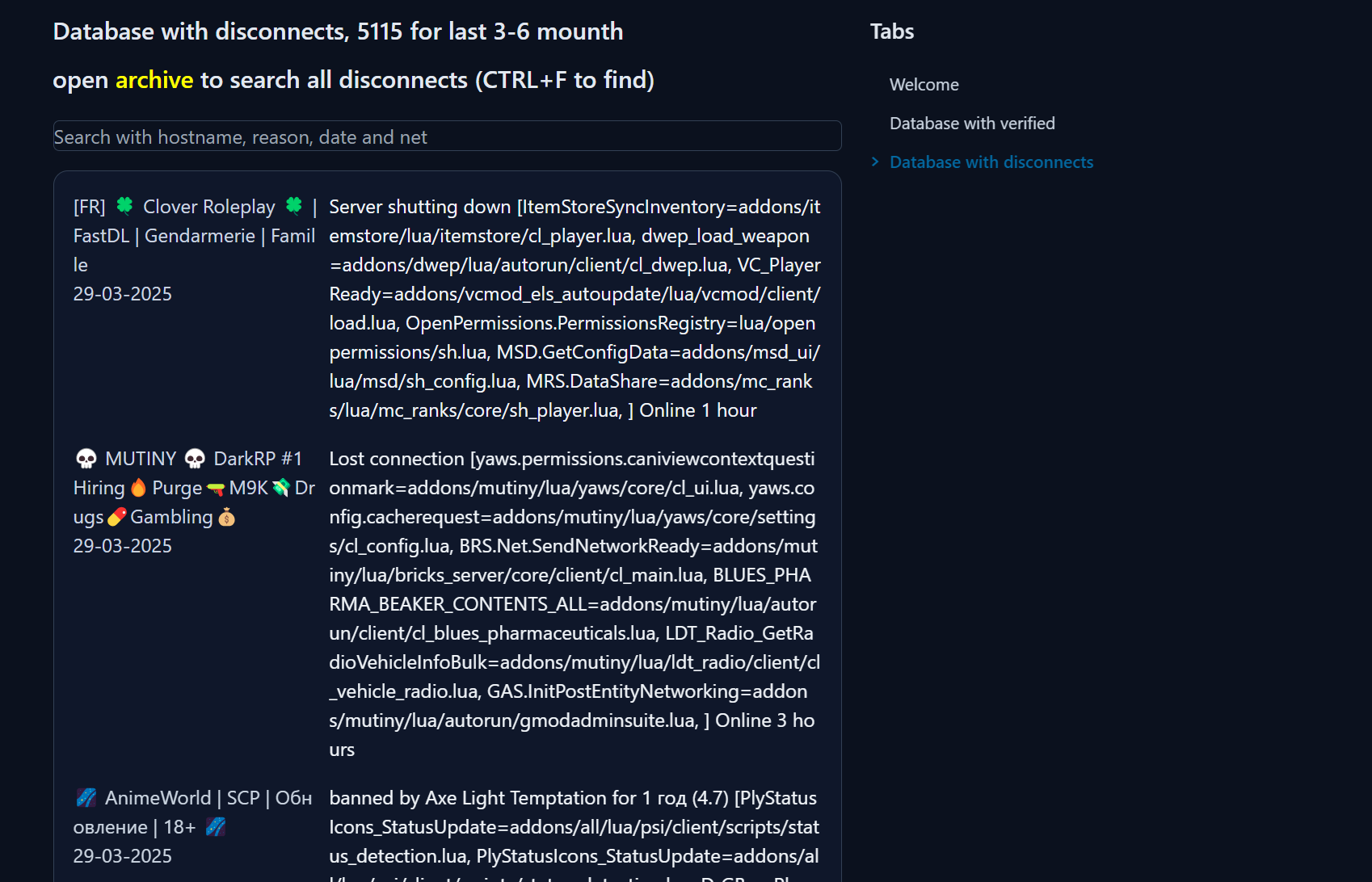 Serv - our database of all servers and user data, every ban or report from user tracks. Even before entering the server you can find out who and how banned other users, how much they played any possible addons issued the ban (or simply leave gmod).